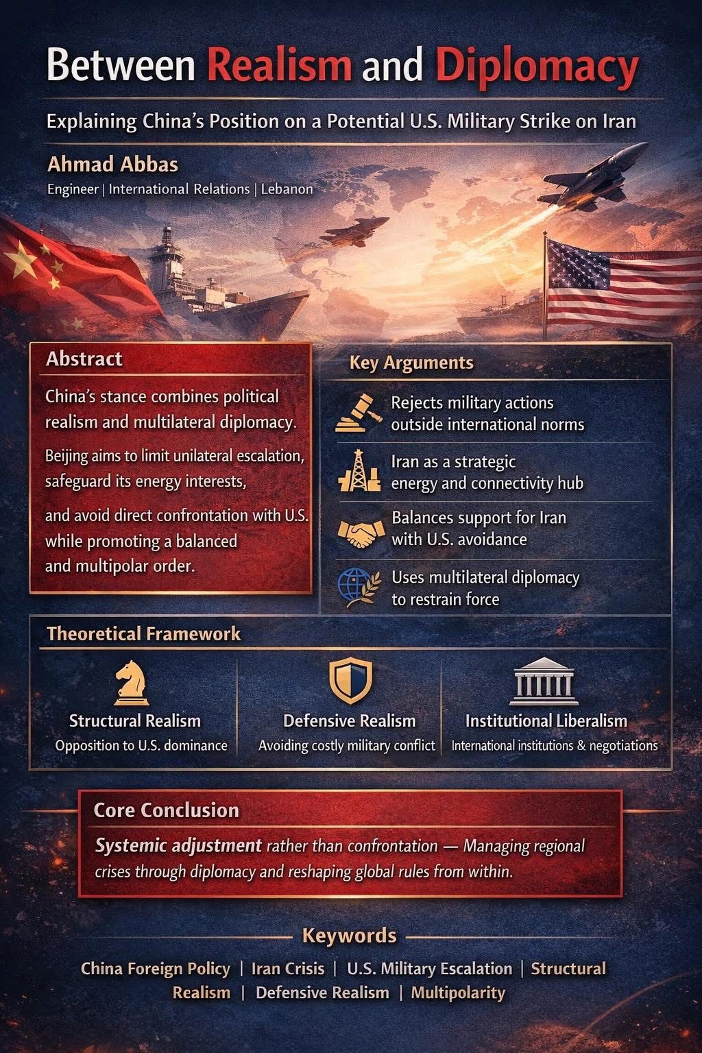 تنطلق هذه الدراسة من فرضية مفادها أن الموقف الصيني من الهجوم الأمريكي المحتمل على إيران لا يمكن فهمه بوصفه موقفًا ظرفيًا أو ردّ فعل تكتيكي، بل باعتباره تعبيرًا عن مقاربة استراتيجية أوسع، تتداخل فيها اعتبارات الواقعية السياسية مع أدوات الدبلوماسية متعددة الأطراف، في ظل تحولات بنيوية يشهدها النظام الدولي المعاصر.